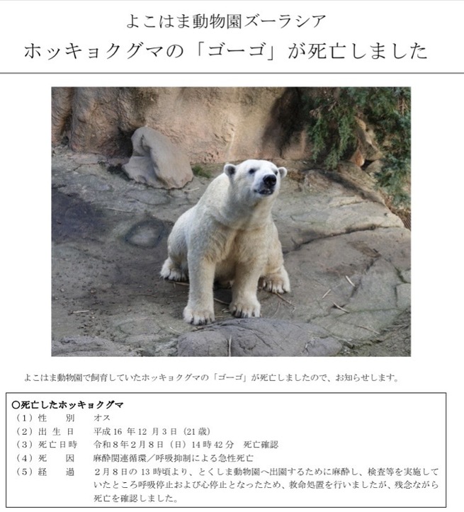 ホッキョクグマの「ゴーゴ」、種の保存のために麻酔され5回採精された直後に死亡